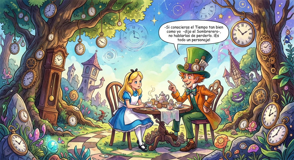 A menudo tratamos al tiempo como una moneda que se gasta o un recurso que se agota. Lo «matamos» cuando estamos aburridos o lo «perdemos» cuando no somos productivos. Sin embargo, el Sombrerero Loco nos regala una bofetada de realidad con su lógica disparatada: el Tiempo es un personaje.
